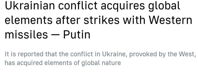 普京在讲话中指出,使用西方制造的导弹袭击俄罗斯已使俄乌冲突具有全球性质。美国及其北约盟国此前宣布允许对俄领土使用其远程精确制导武器,进一步加剧冲突局势。俄方一再强调,没有武器制造国专家的直接参与,使用这些远程武器袭击俄领土是不可能的。
