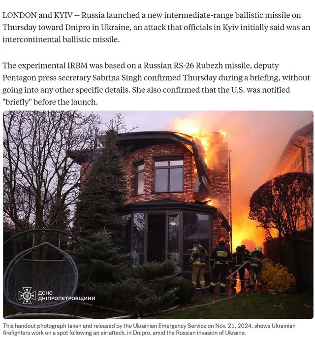 随后有乌克兰和美国官员称,俄军当天发射的“可能是中程弹道导弹”。