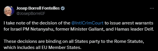 欧盟外交与安全政策高级代表博雷利当地时间21日在社交平台上发文强调,这一决定对《国际刑事法院罗马规约》(简称《罗马规约》)的所有缔约国均具有约束力,其中包括所有欧盟成员国。他强调,国际刑事法院的这一决定“不是政治性的”,并且“必须得到尊重和执行”。