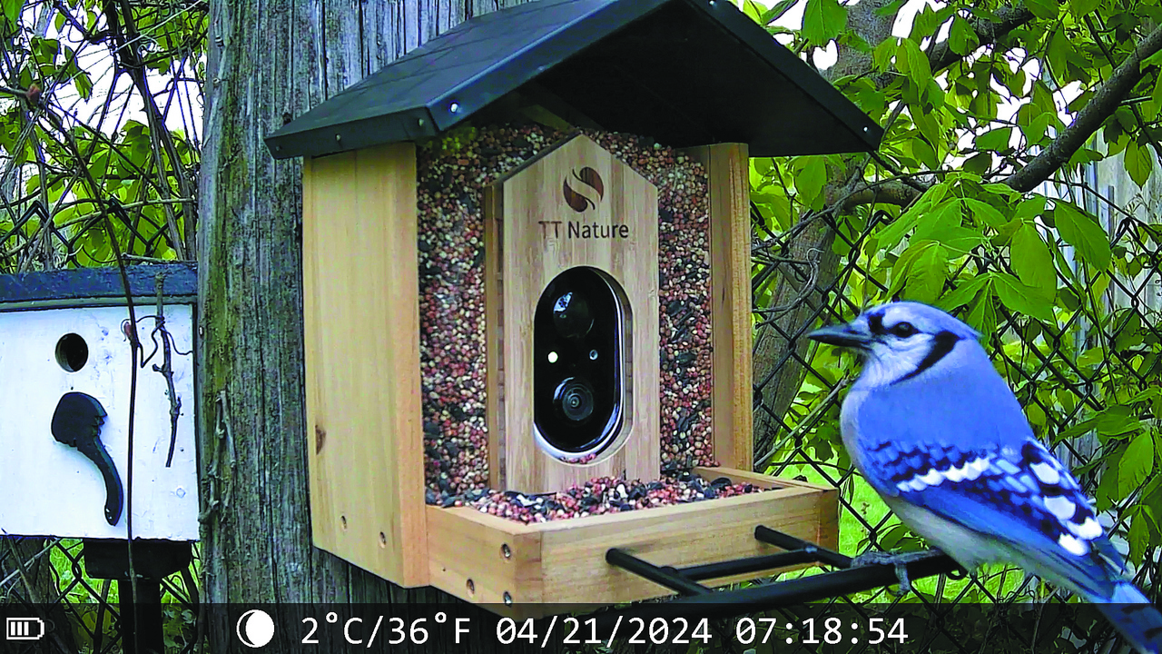 图为一只鸟在优尼家智能喂鸟器前取食,经AI自动识别为冠蓝鸦。受访者供图