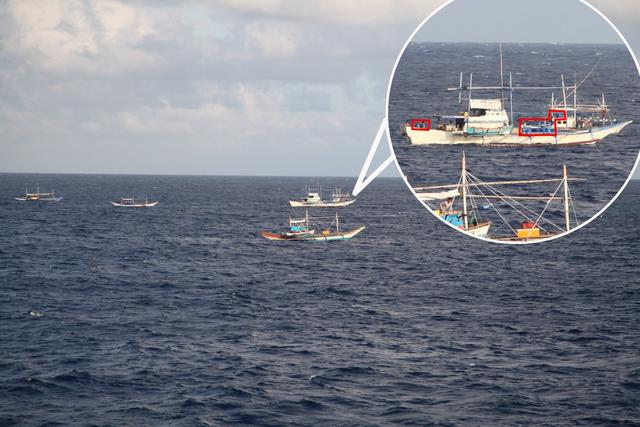 记者3日获得的图片显示,“非法聚集”在鲎藤礁的菲渔船呈现出“编队化”特征。