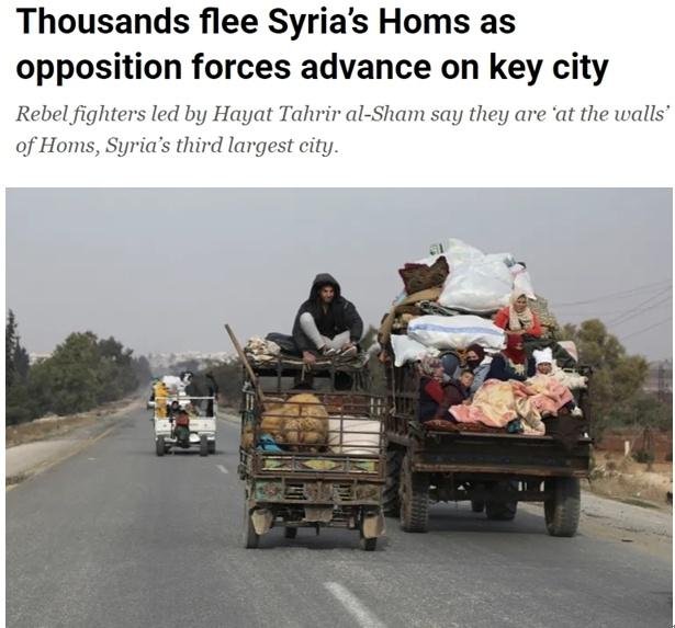 反政府武装11月30日进入叙第二大城市阿勒颇的大部分地区。12月5日,反政府武装宣布控制叙中部城市哈马。哈马失守后,守卫首都大马士革的最后一道重要防线只剩下霍姆斯。