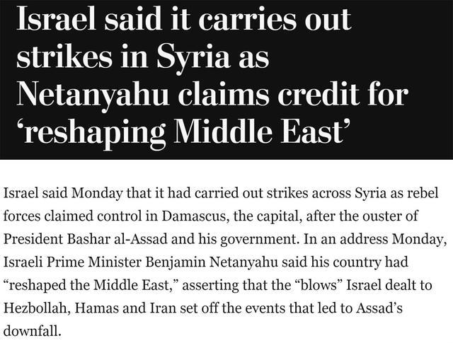 当地时间9日,以色列总理内塔尼亚胡声称,以色列正在“重塑中东”,并表示以色列对黎巴嫩真主党、哈马斯和伊朗的“打击”引发了导致巴沙尔·阿萨德“垮台”的事件。