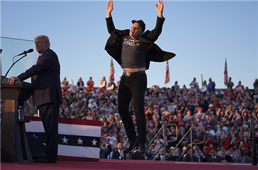△10月5日,马斯克参加特朗普在宾夕法尼亚州举行的竞选集会时,他跳上舞台。