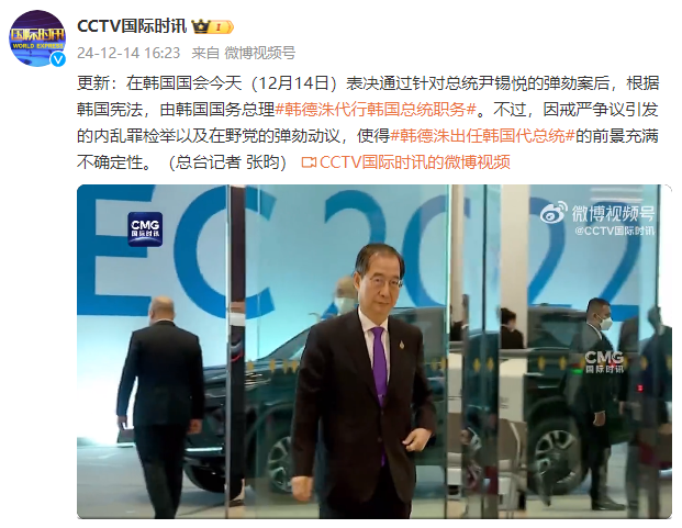 根据韩国宪法,在此期间,韩国国务总理韩德洙将代行总统职务。不过,因戒严争议引发的内乱罪检举以及在野党的弹劾动议,使得韩德洙出任韩国代总统的前景充满不确定性。