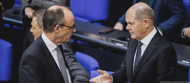△资料图:基民盟主席默茨(左)和德国总理朔尔茨在议会交谈。(图自“德国之声”网站)