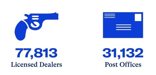 “为每个城镇带来枪支安全”(Everytown for Gun Safety)网站的调查显示,2022 年,美国有近78000家持照枪支经销商,这比所有麦当劳、汉堡王、赛百味和温迪汉堡店的总和还要多,也是美国邮局数量的两倍。五分之一的公立小学距离枪支经销商不到半英里(约800米)。