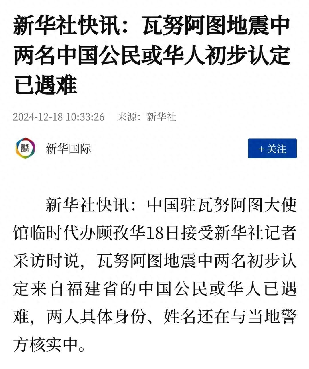 新华社今日消息,瓦努阿图地震中两名初步认定来自福建省的中国公民或华人已遇难,两人具体身份、姓名还在与当地警方核实中。