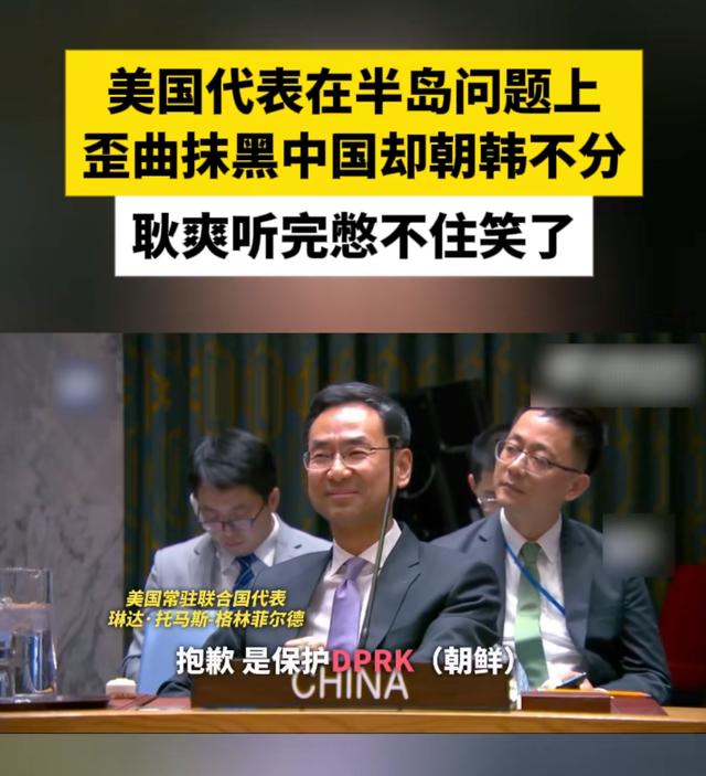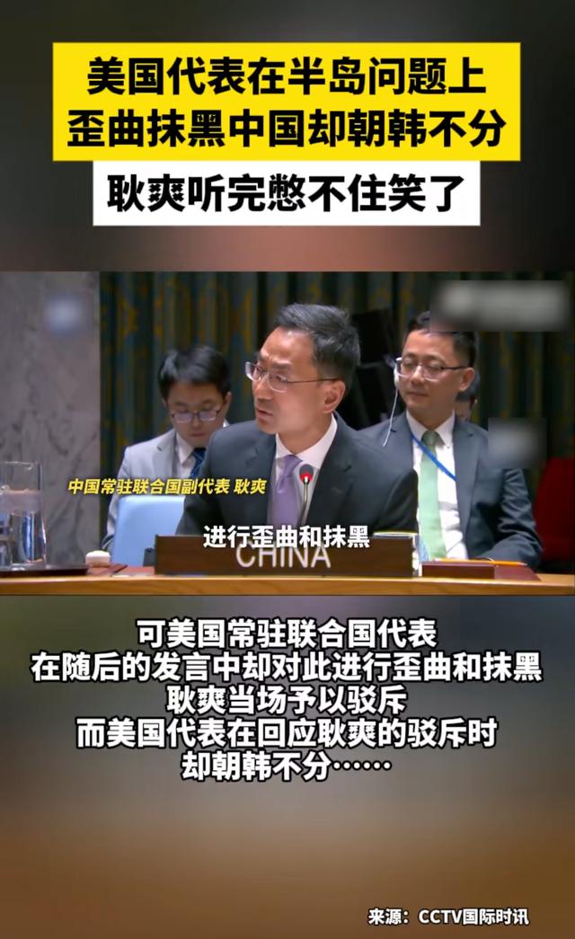 中国常驻联合国副代表耿爽在会上发言,阐述中国在半岛问题上的政策和立场。可美国代表在随后的发言中却对此进行歪曲和抹黑。耿爽当场予以驳斥。而美国代表在回应耿爽的驳斥时,却朝韩不分……