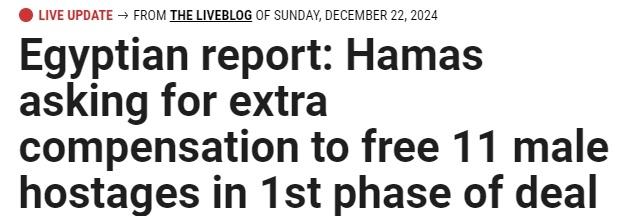 据《以色列时报》和埃及Al-Ghad TV等媒体12月22日援引消息人士内容报道,在以色列和巴勒斯坦伊斯兰抵抗运动(哈马斯)可能达成的协议的第一阶段,以色列将释放250名巴方被扣押人员,以换取关押在加沙的儿童、5名女兵以及年老和生病的人员。