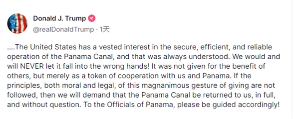 特朗普声称,美国为修建巴拿马运河“付出巨大的生命和财富代价”,运河后被“愚蠢地”交给巴拿马管理,但这不是“让巴拿马去向美国、美国海军和与美国做生意的公司收取高昂的通行费”。美国海军和商业被不公平对待,巴拿马收取的费用是“荒谬的”,特别是考虑到“美国对巴拿马的极大慷慨”,这种对美国的“敲诈”应立即停止,否则“我们将要求巴拿马运河完全归还给美国”,“巴拿马官员,请遵照指示!”