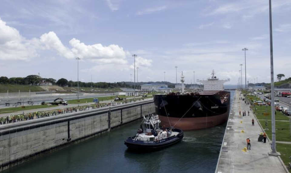 一艘货轮通过巴拿马运河。新华社发