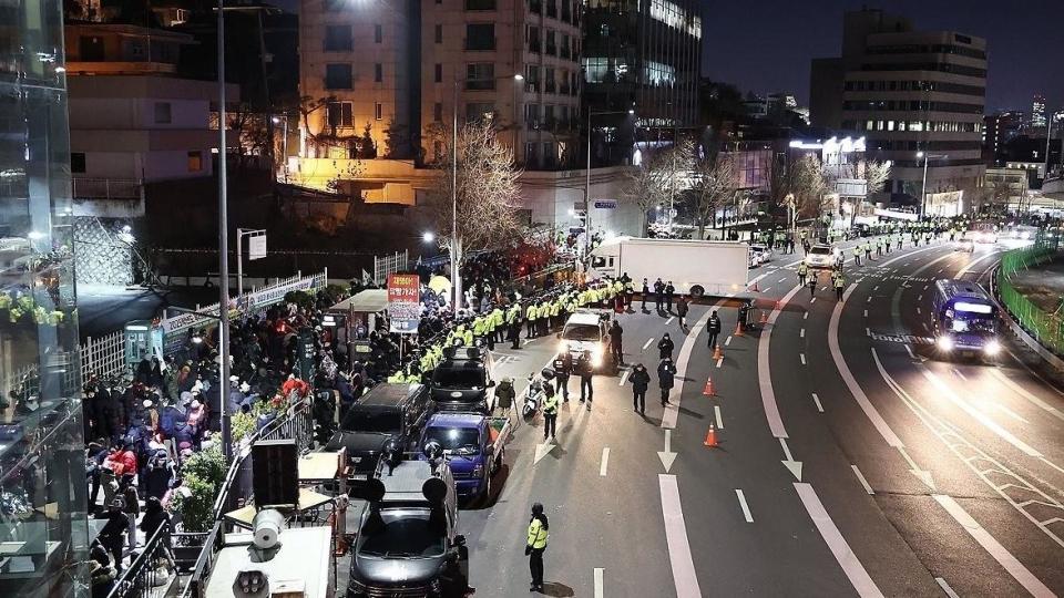 △当地时间1月3日凌晨,韩国首尔龙山区汉南洞总统官邸附近。