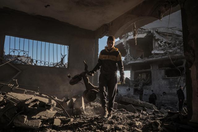 1月3日,在加沙地带中部迈加齐难民营,当地民众查看被以军袭击毁坏的房屋。新华社发(里泽克·阿卜杜勒贾瓦德摄)