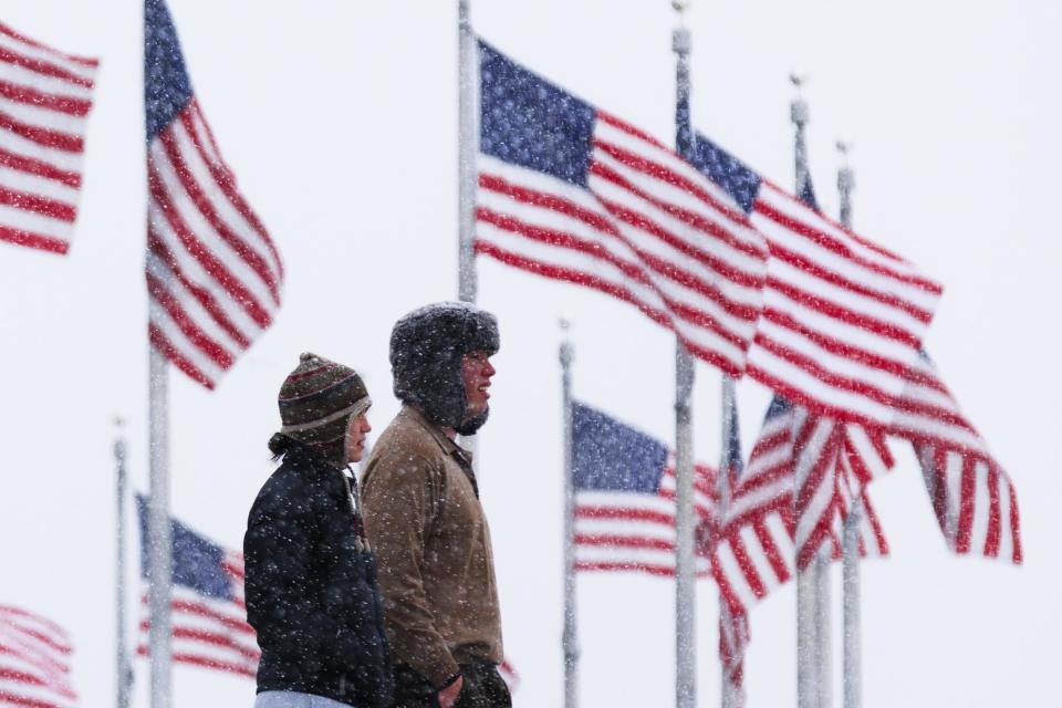 2024年1月15日,在美国首都华盛顿,两名行人冒雪在国家广场散步。新华社发(阿伦摄)