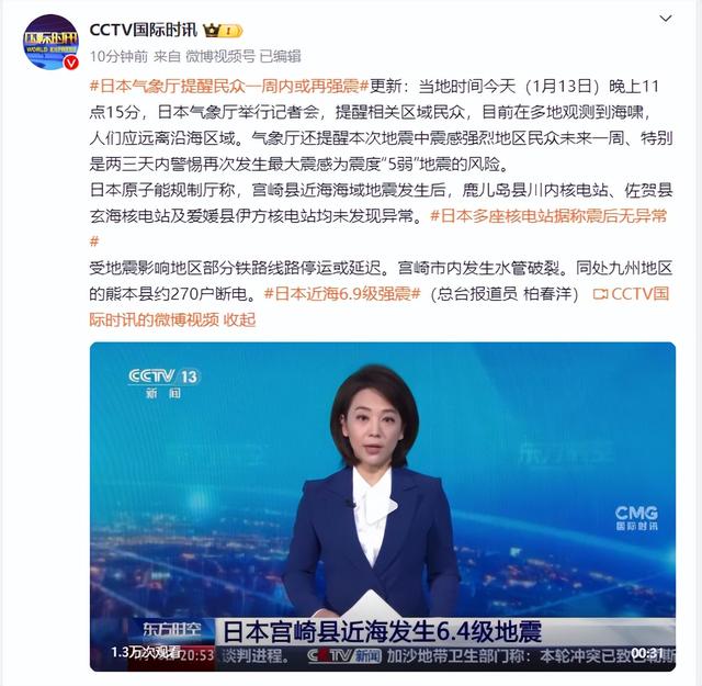 日本原子能规制厅称,宫崎县近海海域地震发生后,鹿儿岛县川内核电站、佐贺县玄海核电站及爱媛县伊方核电站均未发现异常。