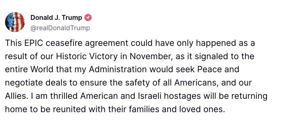 同日,特朗普在他创建的社交平台“真实社交”上发文,将该协议的达成归功于自己在2024年美国总统选举中获胜,并强调其国家安全团队和中东问题特使的贡献。