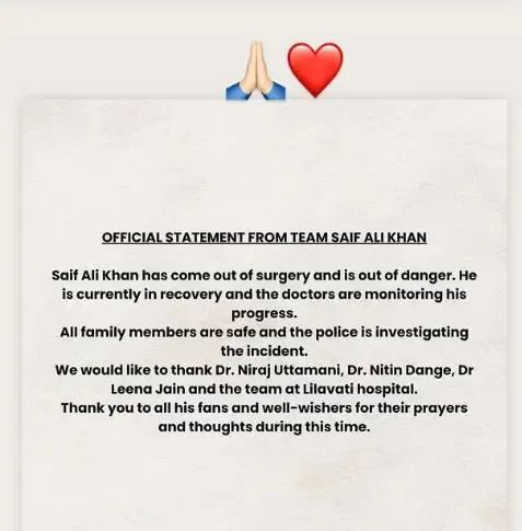 阿里汗的家人在事发之后感谢警方与医院的快速响应,妻子卡琳娜回应,“丈夫已完成手术,暂时完成了第一阶段的抢救工作,目前他已恢复意识,但仍旧很虚弱。希望后面的康复能带来平安,所有人都安全,感谢大家对他的祈祷!”