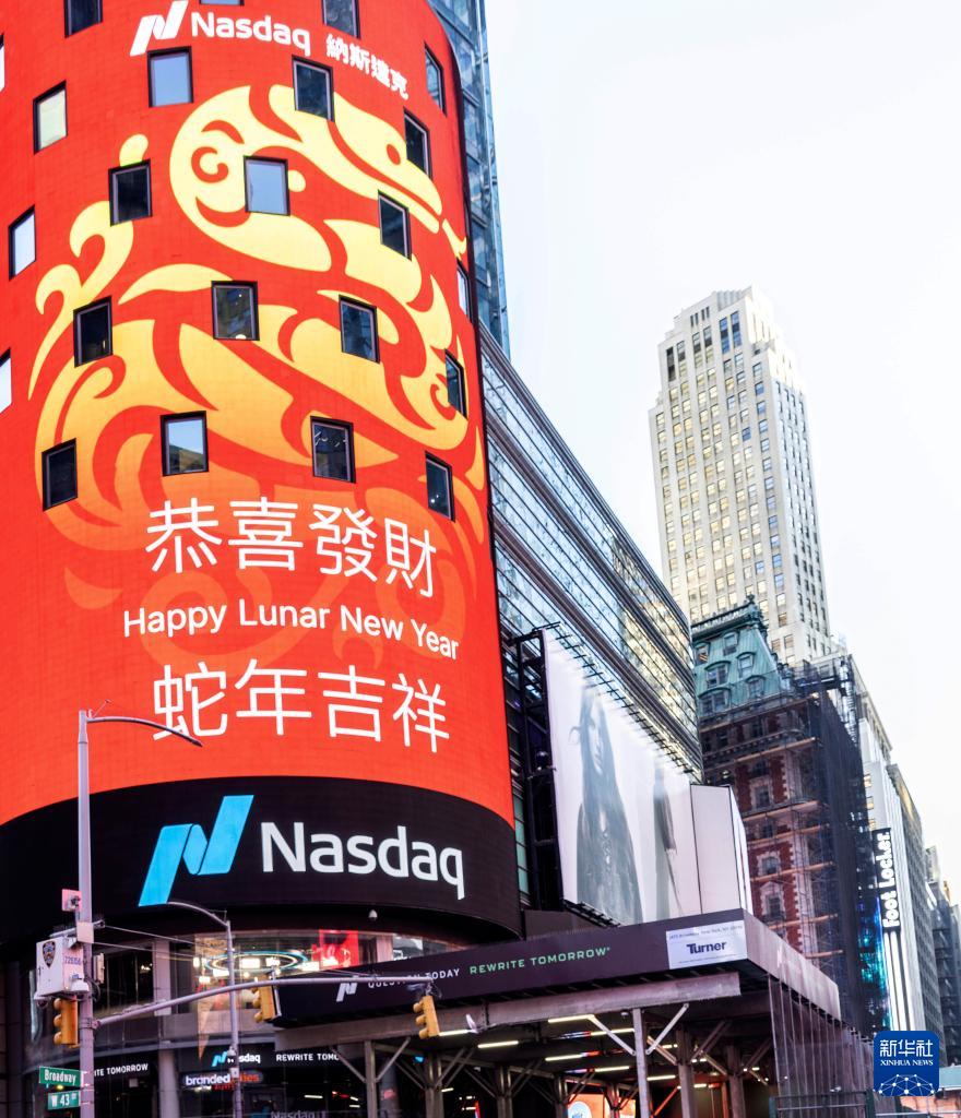 1月27日,在美国纽约,纳斯达克交易所巨型电子屏幕播放蛇年春节祝福。新华社发(周焕新摄)