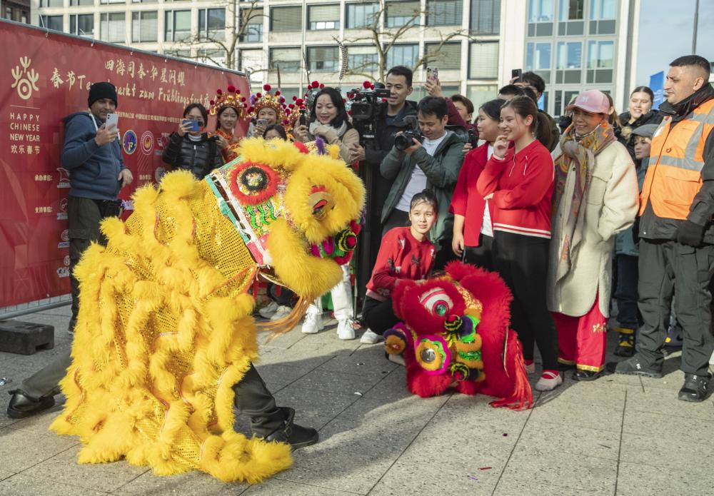 1月31日,在德国法兰克福市中心卫戍广场,舞狮演员与观众互动。新华社记者 张帆 摄