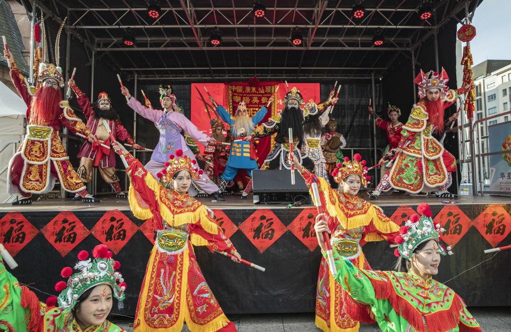 1月31日,潮汕英歌舞队在德国法兰克福的卫戍广场表演。新华社记者 张帆 摄