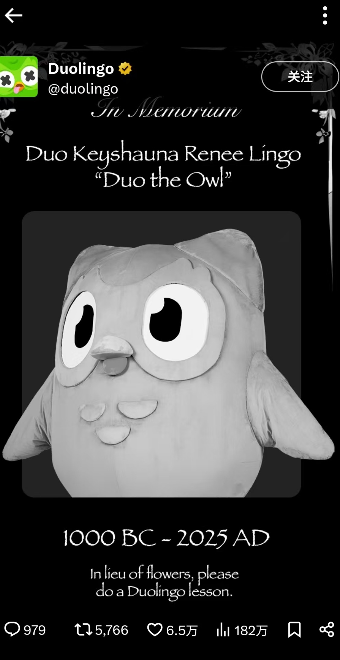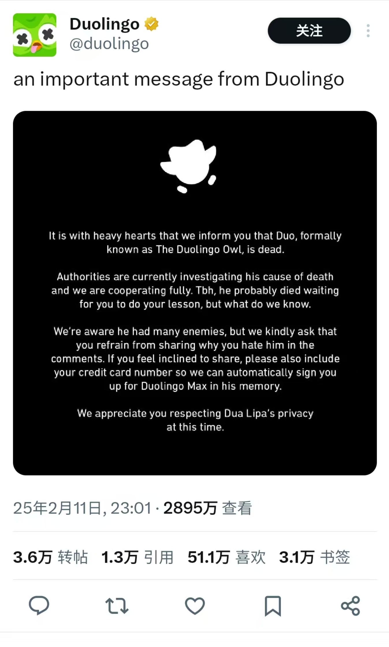 官方声明中写道:“我们怀着沉重的心情告诉大家,Duo——曾被称为多邻国猫头鹰——已故。我们目前正在调查他的死因。老实说,他可能是在等你做作业的时候死的,但我们也不太清楚。我们知道他有很多敌人,但请不要在评论中分享你讨厌他的原因。如果你愿意分享,请附上你的信用卡号,这样我们就能为你自动注册Duolingo Max,以此纪念他。”