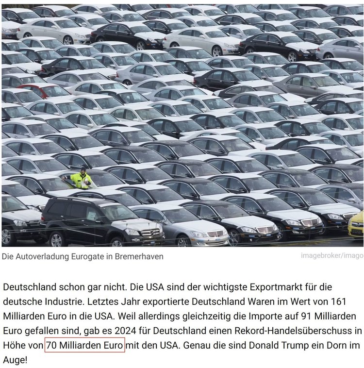 德国媒体报道称,德国去年的对美贸易顺差达到创纪录的700亿欧元。由于欧盟10%的汽车进口关税高于美国的2.5%,美国的“对等关税”无疑将使德国汽车行业受到特别大的影响。