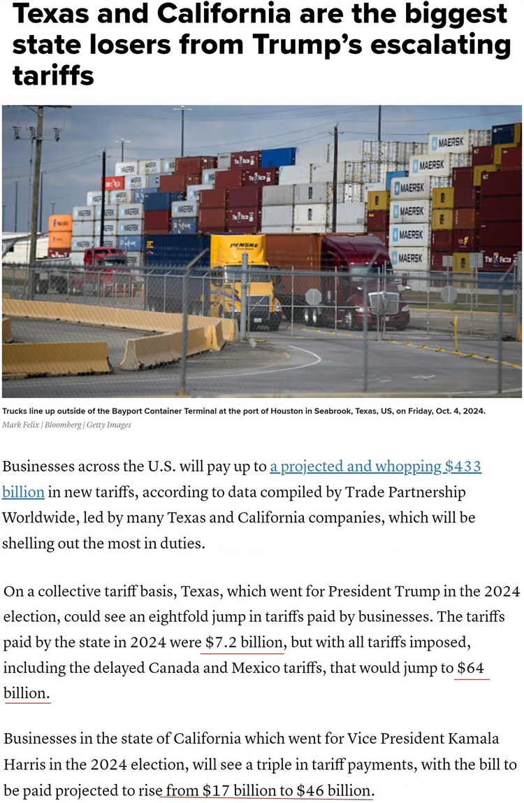 据估算,得克萨斯州企业2024年支付的关税成本为72亿美元。如果加上特朗普政府新加征的所有关税,包括推迟加征的对加拿大和墨西哥全面关税,得州2025年支付的关税成本可能会增加8倍,飙升至640亿美元。