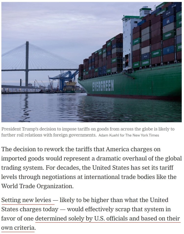 《纽约时报》称,数十年来,美国一直通过世界贸易组织等国际贸易机构的多边谈判来设定关税水平,但如今,新的关税可能变为完全由美国官员根据自己的标准来决定。