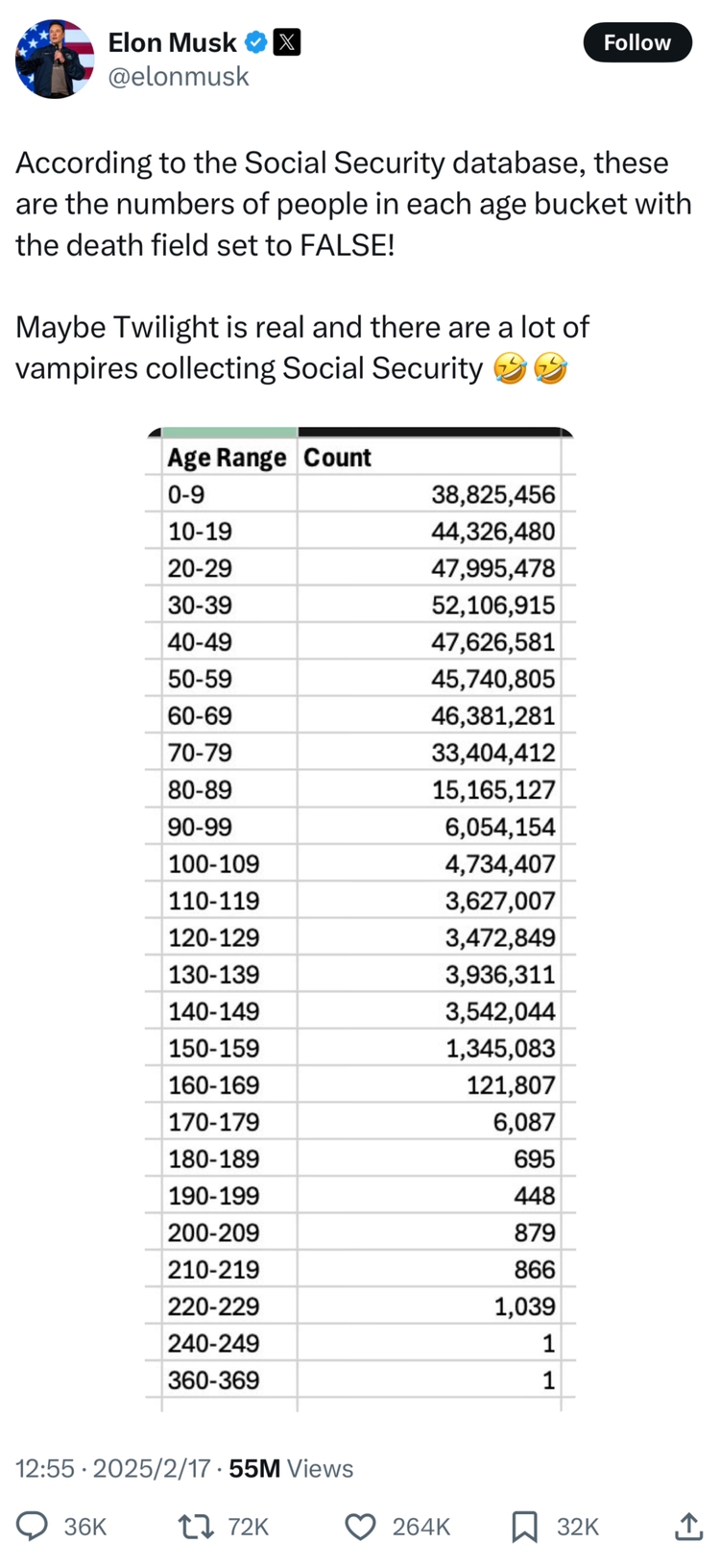 根据公布的数据,美国官方的社保数据库中总共有3.98亿个“活人”,但美国政府数据显示,该国只有约3.41亿人。同时,美国社保数据库中显示依旧存活的人员中,有134.5万名150岁-159岁的老人,160-169岁的老人有12.1万人,而超过200岁的老人竟有2786人,更是有一名240-249岁的老人,以及一名360-369岁的老人。