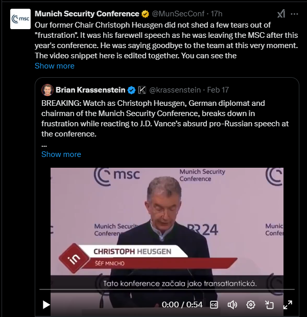 慕安会在其X账号发帖澄清慕安会主席克里斯托夫·霍伊斯根在慕安会闭幕式上落泪一事。(图为慕安会X账号截图)