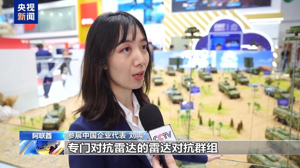 参展中国企业代表 刘爽:比如说我们有专门对抗雷达的雷达对抗群组,有专门针对敌方无线电通信的,对它实施干扰的这么一个群组,还有我们在后边展示的末端防护群组。这个就是主要针对现在战场上的小型无人机,拥有多种多样的对抗无人机的功能。