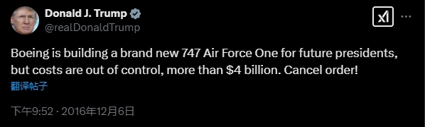 2016年,特朗普在胜选后,曾批评波音在“空军一号”2.0项目中要价“离谱”,他称: