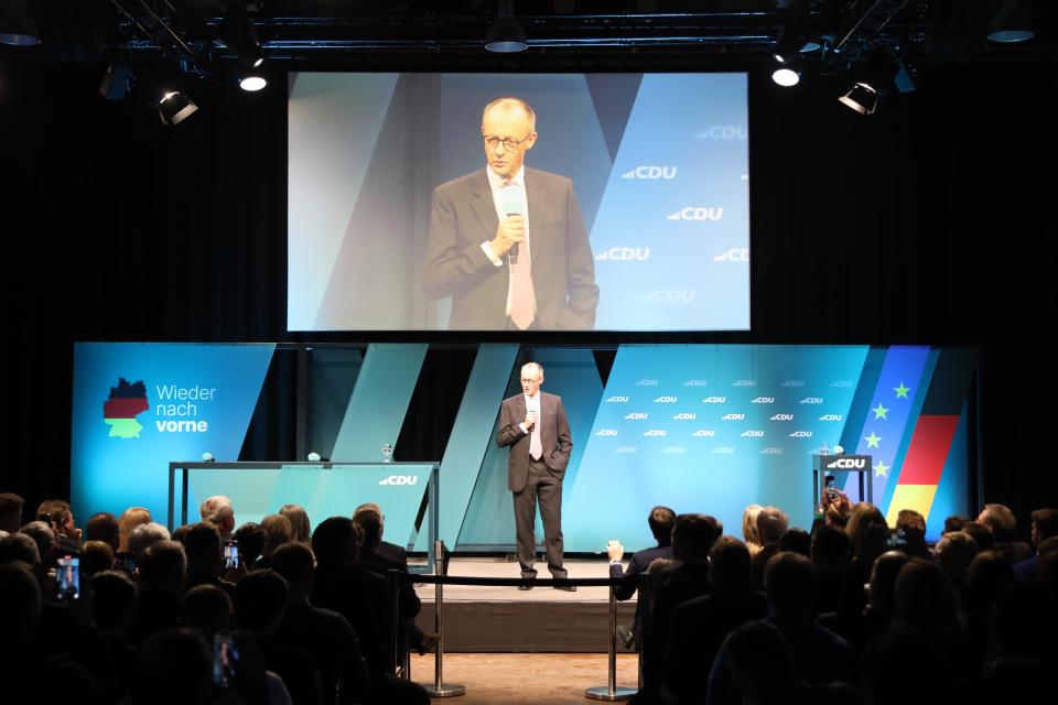 2月18日,在德国波茨坦,德国联盟党总理候选人默茨在竞选集会上讲话。新华社记者杜哲宇摄