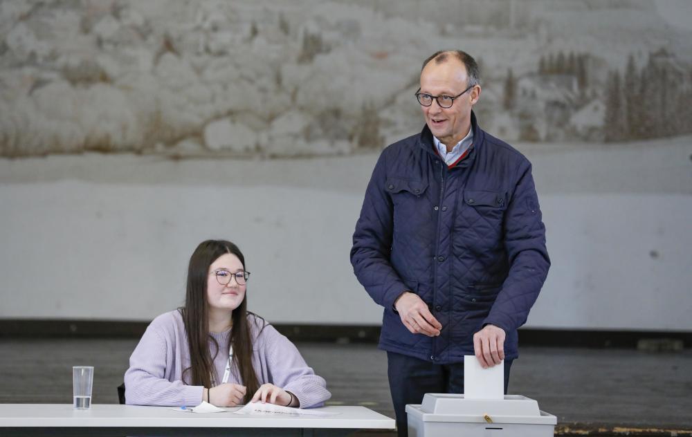 2月23日,在德国北莱茵-威斯特法伦州阿恩斯贝格,德国联盟党总理候选人默茨在一处投票站投票。新华社记者 张帆 摄