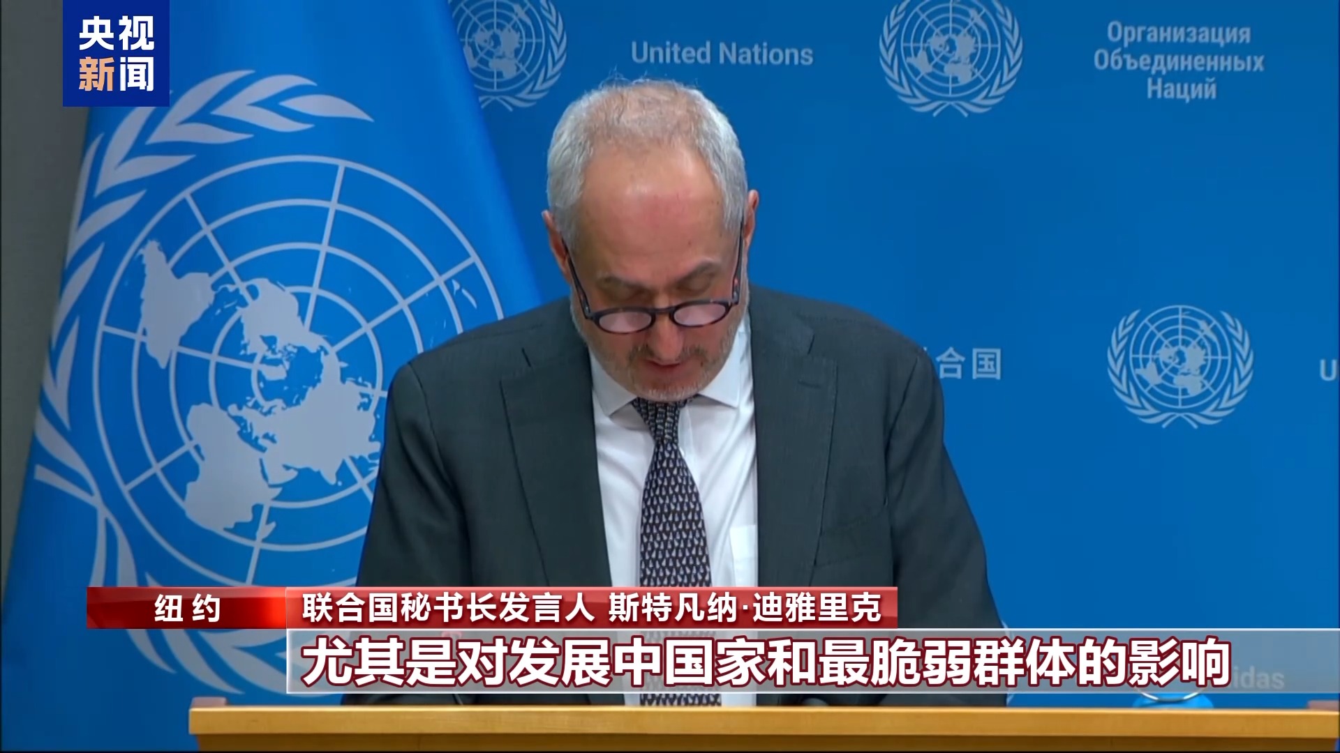联合国秘书长发言人 斯特凡纳·迪雅里克:我的意思是,显然在关税问题上,我们关注日益增长的贸易限制措施对全球经济的影响,尤其是对发展中国家和最脆弱群体的影响。正如你所知,来自多个渠道的数据显示,全球经济已经处于低增长环境。