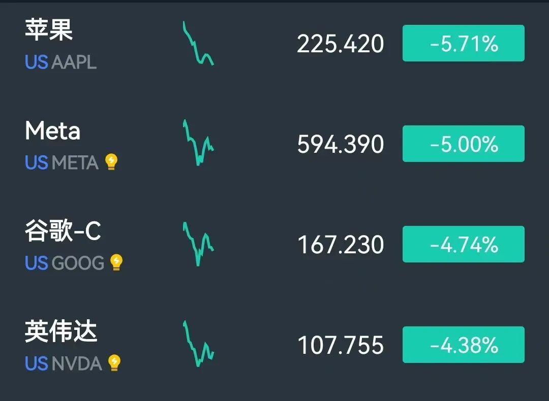 其他美国科技股龙头也集体暴跌,无一幸免。其中,苹果跌超5.71%,Meta下跌5%,谷歌下跌4.74%;英伟达下跌4.34%,触及6个月以来低点。