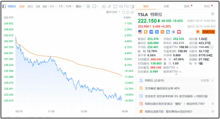 此外,特斯拉跌超15%,为2020年9月以来最大单日跌幅,市值一夜蒸发1303亿美元(约合人民币9459亿元),当前股价较历史高点已遭“腰斩”。
