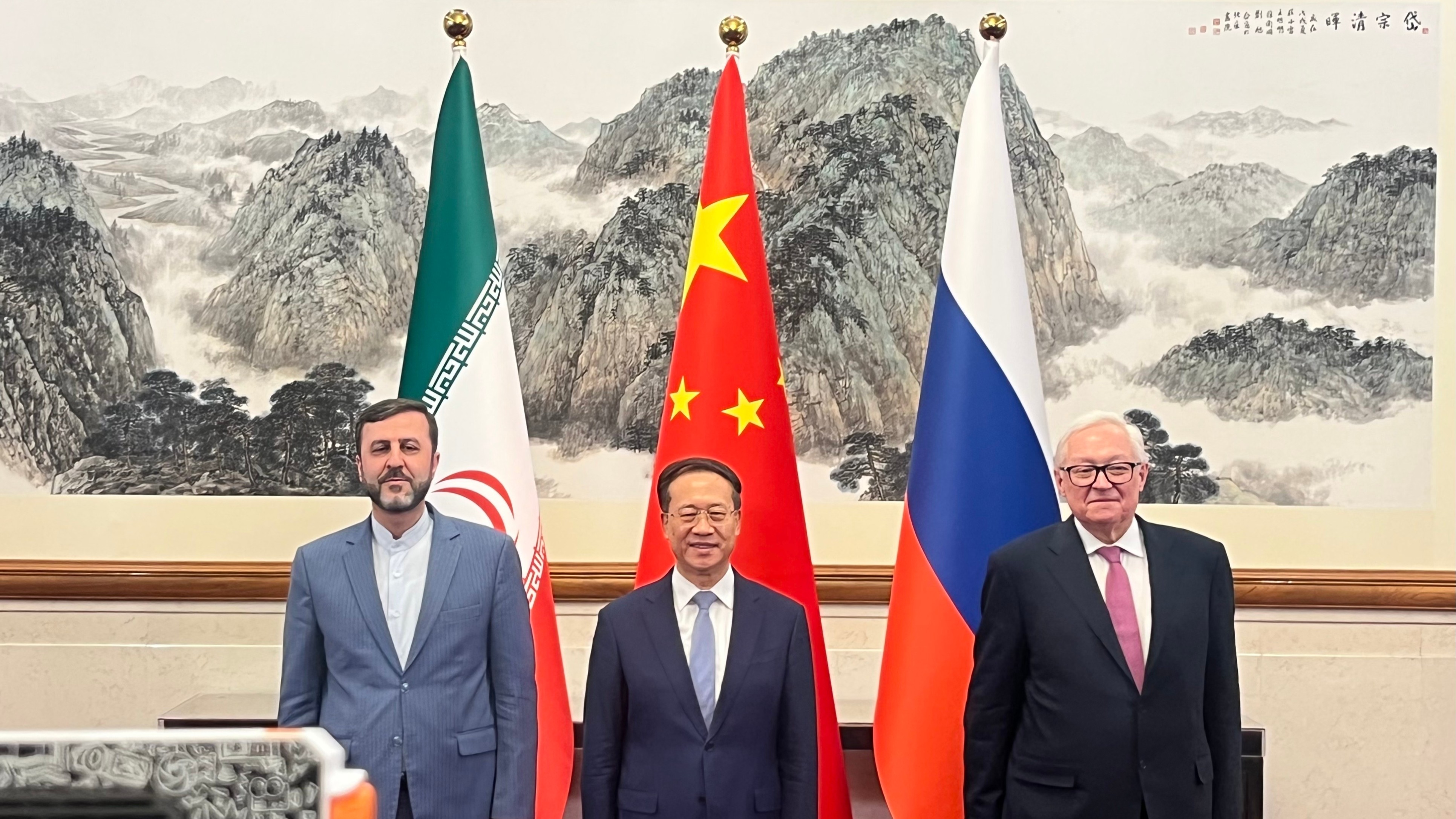 今天上午,中方举行伊朗核问题中俄伊北京会晤。会晤前的合影环节,俄方见站得远了,朝中方靠近了两步。