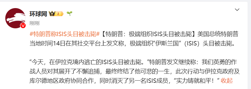 美国总统特朗普当地时间14日在其社交平台上发文称,极端组织“伊斯兰国”(ISIS)头目被击毙。“今天,在伊拉克境内逃亡的ISIS头目被击毙。”特朗普发文继续称:我们英勇的作战人员对其展开了不懈追捕,最终终结了他可悲的一生,此次行动与伊拉克政府及库尔德地区政府协同合作,同时消灭了另一名ISIS成员,“实力铸就和平!”
