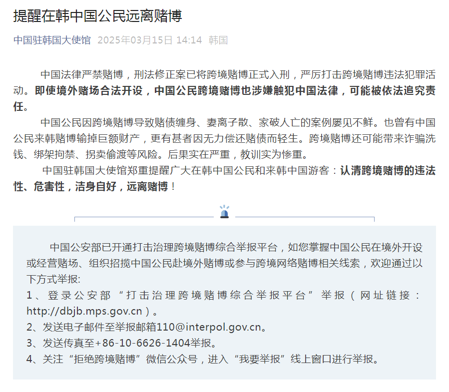 中国驻韩国大使馆郑重提醒广大在韩中国公民和来韩中国游客:认清跨境赌博的违法性、危害性,洁身自好,远离赌博!