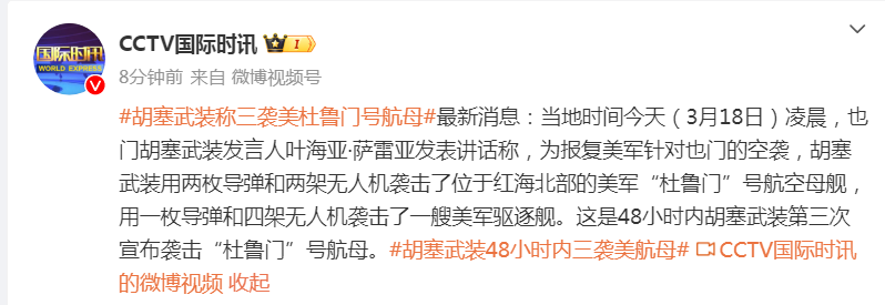 当地时间3月18日凌晨,也门胡塞武装发言人叶海亚·萨雷亚发表讲话称,为报复美军针对也门的空袭,胡塞武装用两枚导弹和两架无人机袭击了位于红海北部的美军“杜鲁门”号航空母舰,用一枚导弹和四架无人机袭击了一艘美军驱逐舰。这是48小时内胡塞武装第三次宣布袭击“杜鲁门”号航母。
