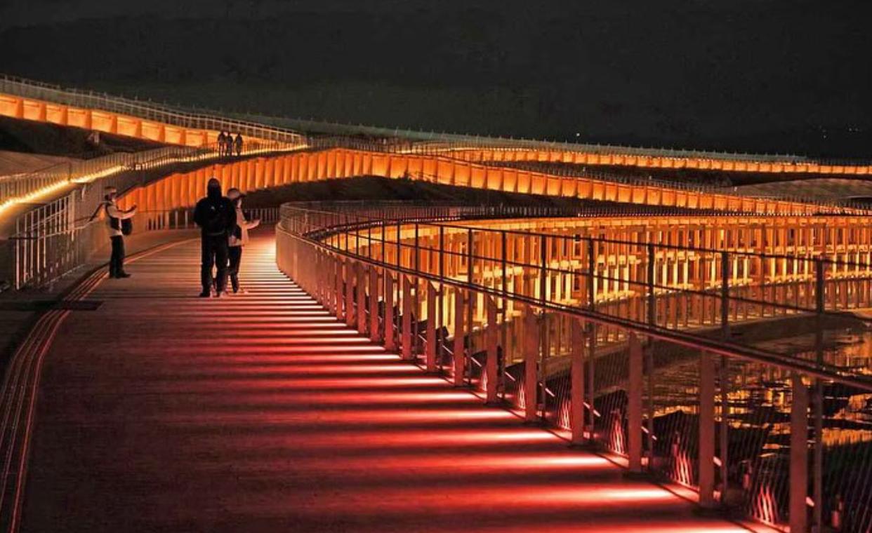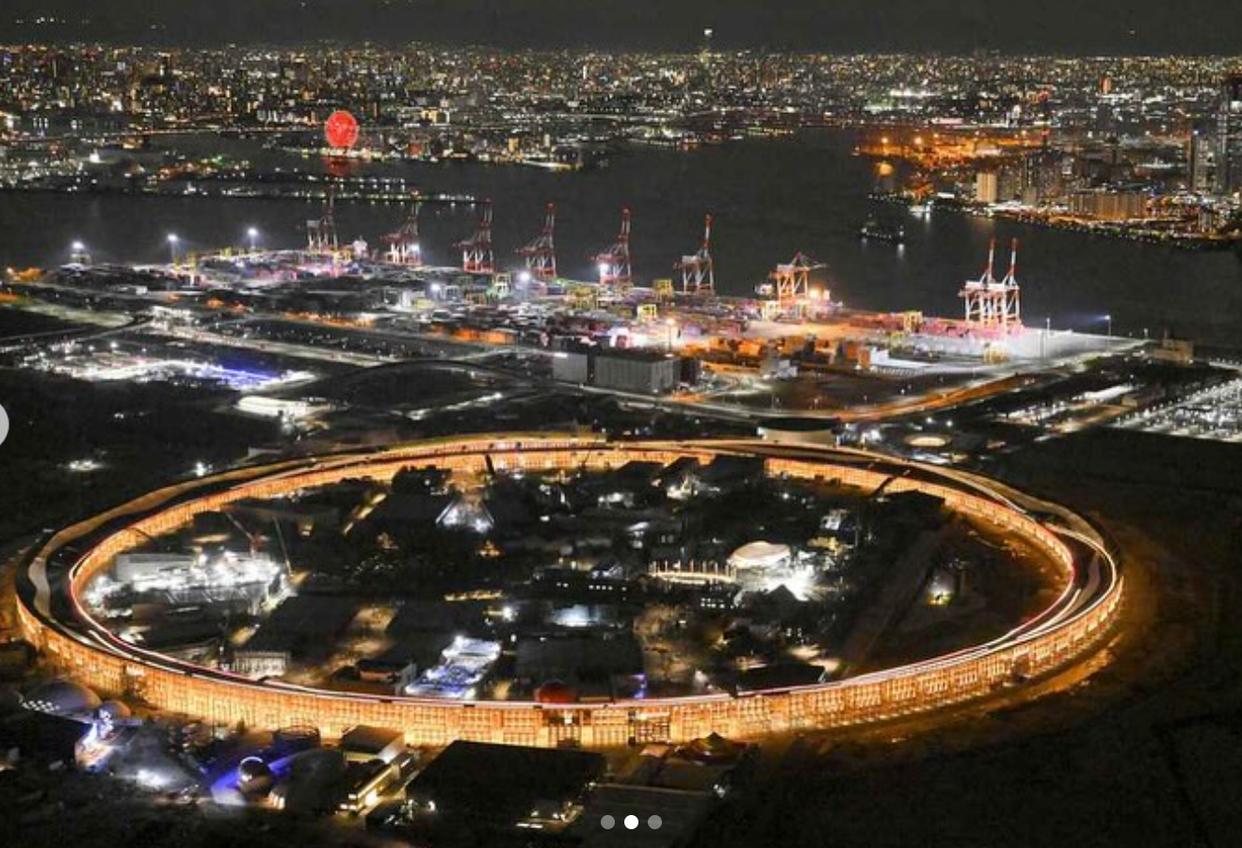 在负责主场馆建设的建筑师藤本壮介看来,“大环屋顶”是整个会场最亮眼的标志性设计。据悉,这个伫立在海边的巨大环形屋顶总面积超过61万平方米,周长大约为2公里,离地面的高度约为20米。更重要的是,这个“大环屋顶”完全由木结构打造完成,总共使用了2.7万立方米的木材,包括日本的柏木、雪松以及欧洲红松。