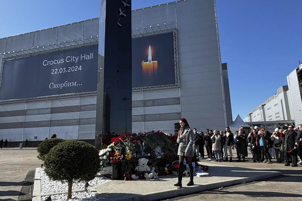 当天,民众来到莫斯科西北郊外的“克罗库斯城”音乐厅门前广场悼念恐袭受害者。3月22日是“克罗库斯城”音乐厅恐袭事件满一周年的日子,这起袭击事件造成144人死亡、551人受伤。