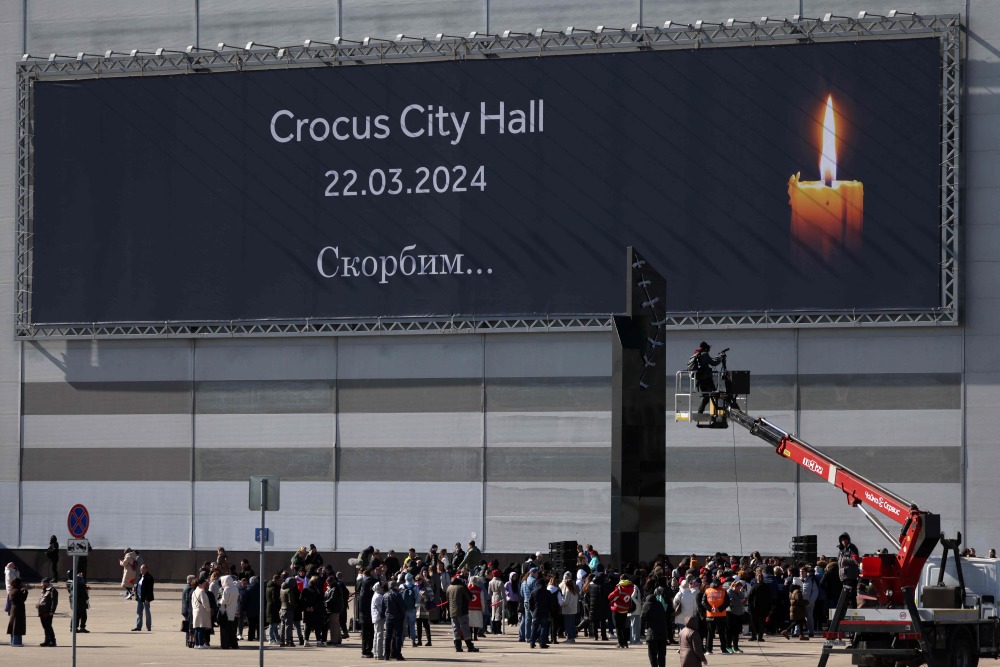 3月22日,在俄罗斯莫斯科郊外的“克罗库斯城”音乐厅门前广场上,人们在恐袭受害者纪念碑前悼念。新华社/法新