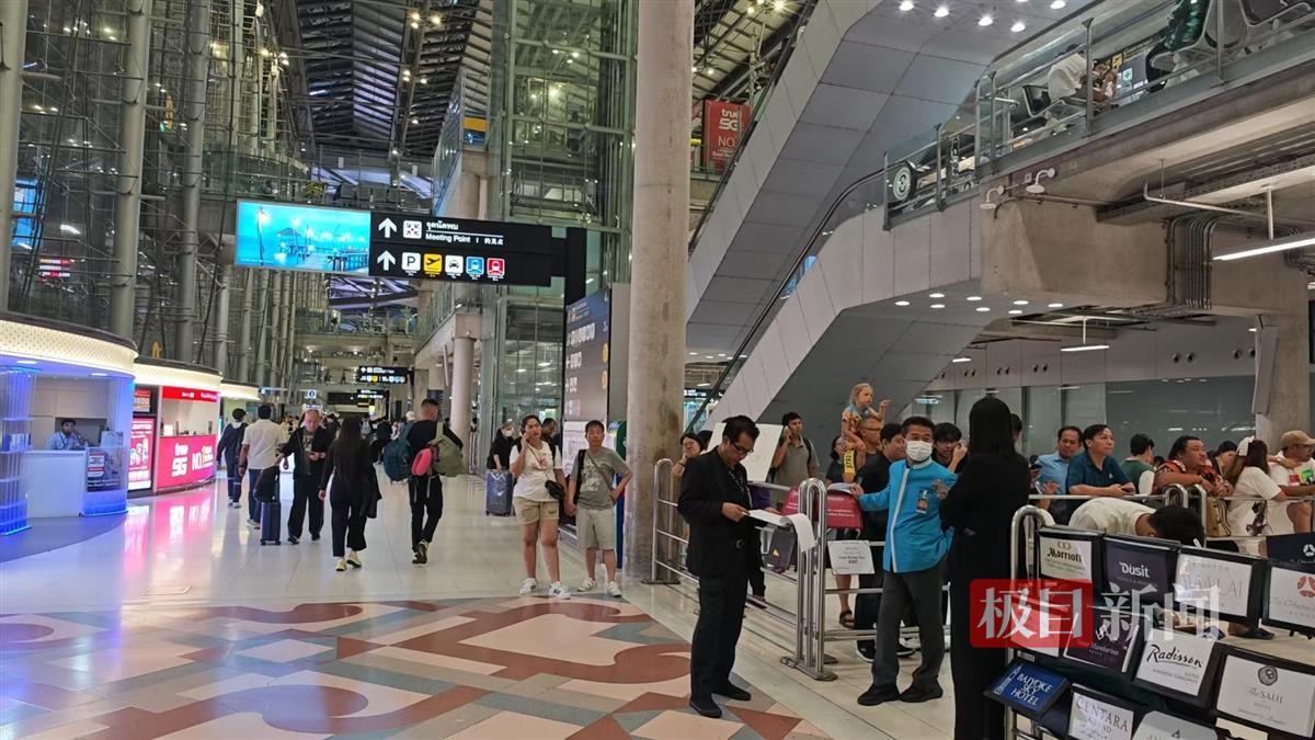 29日晚8时许,极目新闻记者在泰国曼谷素万那普机场看到,机场旅客人流较多,指示牌显示,大多数航班起飞和到达时间正常。