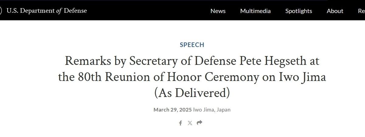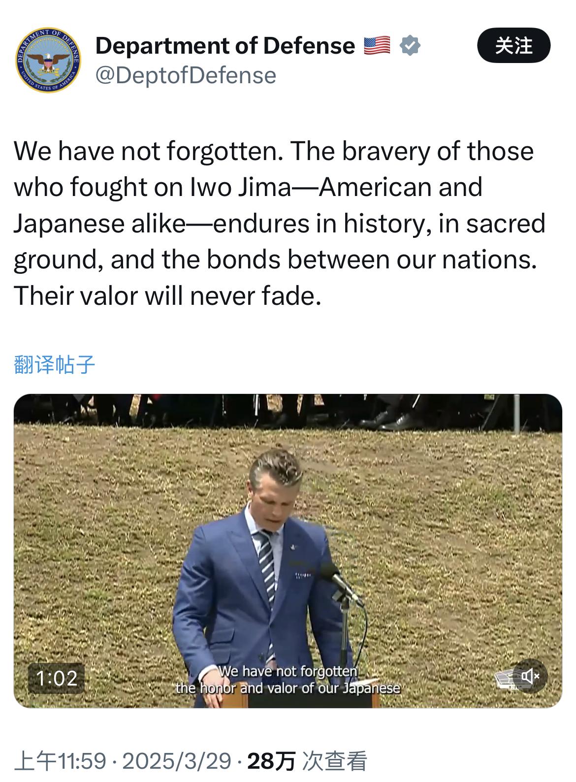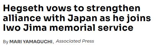 外媒报道:赫格塞思在参加硫磺岛战役纪念仪式上,誓言要加强与日本的联盟