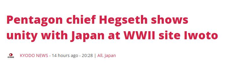 日媒报道:五角大楼负责人赫格塞思在二战纪念仪式上展现了美日团结