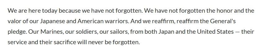 赫格塞思在致辞时称:“我们不会忘记在硫磺岛作战的美国和日本士兵展现出的勇敢精神。这种精神,将在历史的长河中、在这片神圣的土地上,以及美日两国的盟友关系间永垂不朽,他们的英勇事迹永不褪色。”