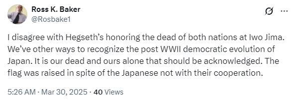 有网友称:我不同意赫格塞思纪念硫磺岛战役中两国的阵亡者,只有我们的阵亡者才值得纪念。